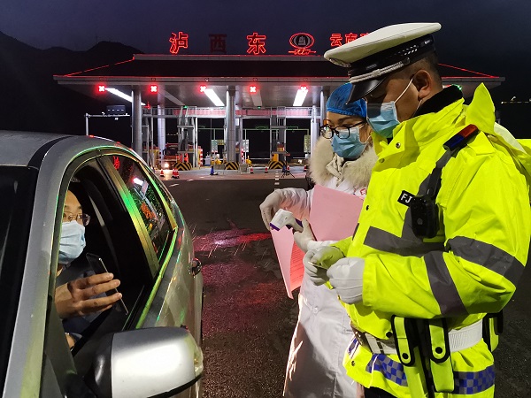 瀘西縣公安民警們?nèi)找箞允卦诟鱾€高速公路路口處,摸排外來人員,監(jiān)測體溫,詳細詢問往來人員出發(fā)地、途徑地、目的地等信息,當好群眾健康“守門人”。(徐艾玲 攝)