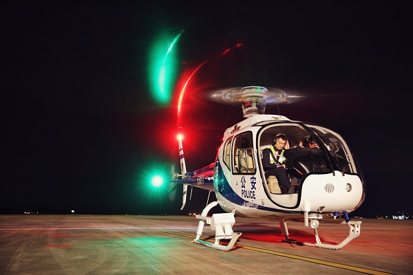 入夜,警航直升機準備起飛,城市的夜空不只有霓虹燈和月光,還有公安民警的多維度守護。他們俯視春城的每一個角落,讓罪惡無處可藏。(蔣迪亞 攝)