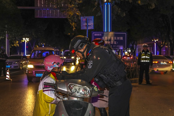 最豪邁的誓言,最莊嚴的承諾,最有力的擔當,警察的護航是夜里最亮的燈。(金武鑫 攝)