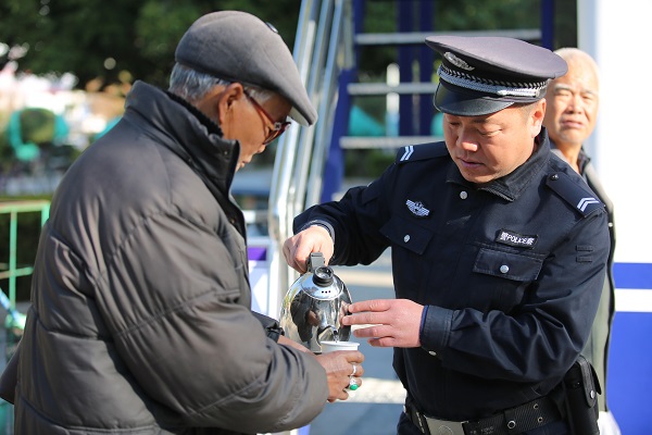 發(fā)現(xiàn)迷路的老人,暖心民警在安撫老人的同時為其送上溫水,多方打聽找到老人的家人并送他回家。(李薇 攝)