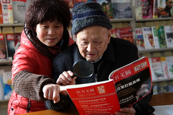 安寧市的志愿者們?yōu)榭粘怖先舜蛟炝艘粋€老年書屋。這里其樂融融,志愿者陪著老人談心看書,給老人們送去春天般的溫暖。(黃志琴 攝)