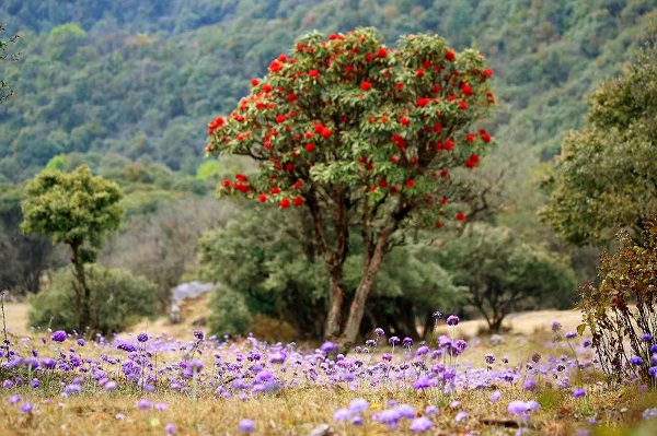春風和煦,一陣暖風吹過,大樹杜鵑開得熱烈,滿山遍野的迎春花也紛紛探出頭來,星星點點,把山野點綴得如夢如幻、生機盎然。(楊新洲 攝)