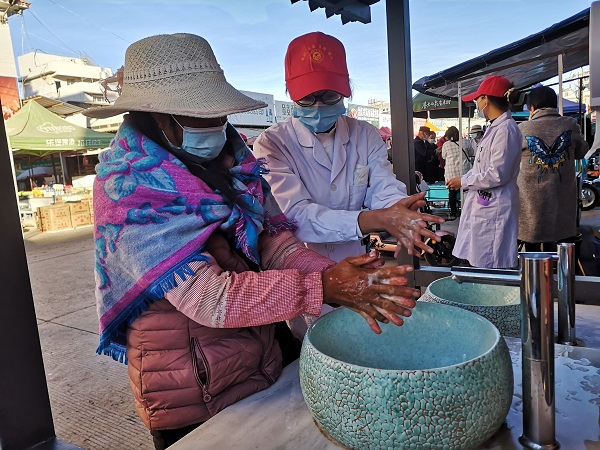“大媽,您看,洗手的正確步驟是這樣的……”祥云縣衛(wèi)健系統(tǒng)的志愿者們走上街頭,教群眾七步洗手法,引導(dǎo)群眾養(yǎng)成勤洗手、講衛(wèi)生的好習(xí)慣。(趙秋艷 攝)