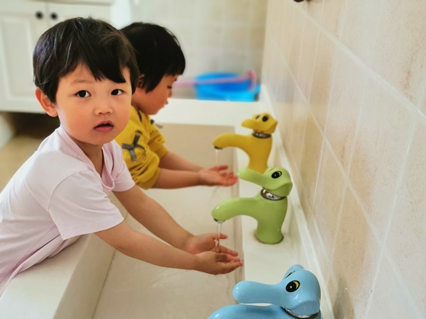 “內(nèi)外夾弓大立腕”,在東川區(qū)金蘋果幼兒園,小朋友每天都按照老師教授的七步洗手法洗手,自覺養(yǎng)成講衛(wèi)生、勤洗手的好習(xí)慣。(朱興鳳 攝)