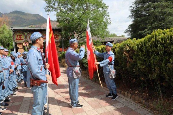 大家身穿紅軍軍服、佩戴黨徽,舉行授旗儀式,紅旗招展、精神奮發(fā),踏上了重走紅軍長征路的征程。