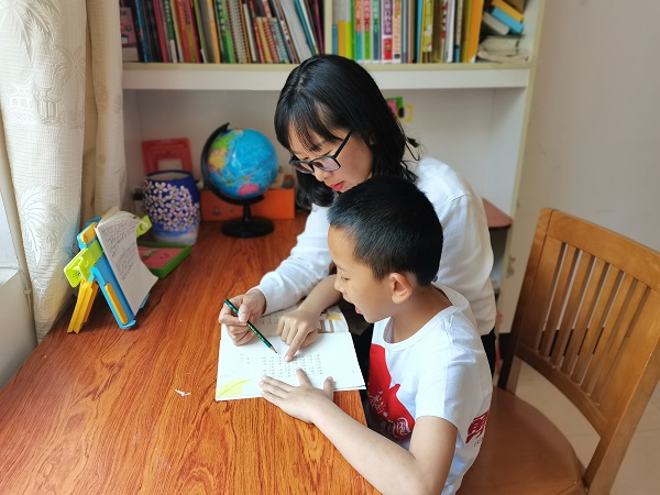 剛下班的媽媽認真傾聽孩子朗讀新學會的課文,不時幫助孩子糾正著發音。(李正麗 攝)