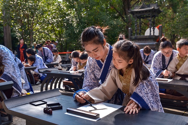 紀檢監察女干部陪著孩子來到文廟,在濃厚的儒家文化氛圍中開啟女兒的人生“第一課”,讓她在第一次書寫“人”字的一撇一捺之中感受學習的快樂。(宗慶 攝)