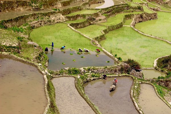 元陽縣新街鎮棕批寨的農戶們搶抓農時,齊心協力,一邊犁地一邊插秧,在大家的忙碌中,一幅綠色的畫卷正在田中慢慢鋪展開來。(張朝福 攝)