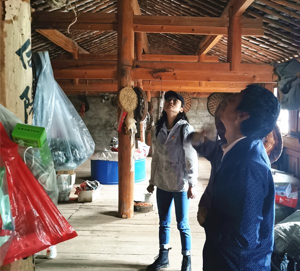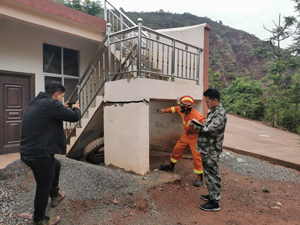 安龍堡鄉紀檢干部與評估人員共同查看記錄房屋受損情況。(韋劍 攝)