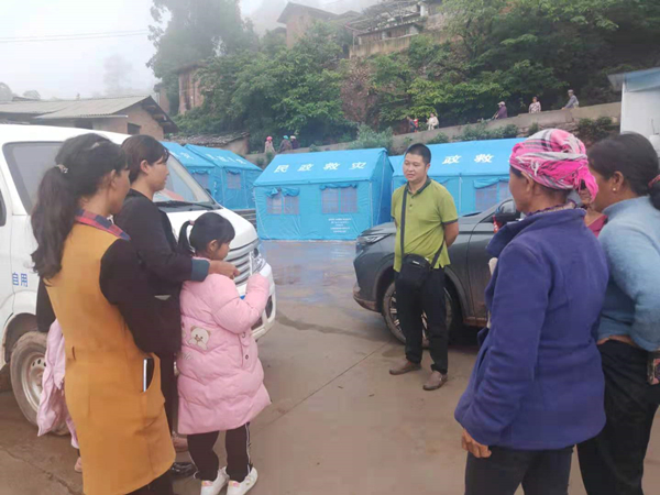 縣紀委監委應對地震專項監督檢查工作組在受災較重的大麥地鎮光明村抗震救災安置點安撫群眾,并及時向群眾宣講避震知識。(王先才 攝)