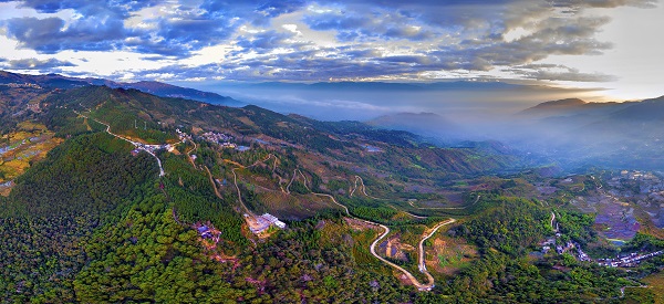 家鄉(xiāng)多山,數峰漠漠云濤起,萬翠悠悠天路橫。登高望遠,人間異景尋常在,放眼抒懷須早行。(梁健倫 攝)