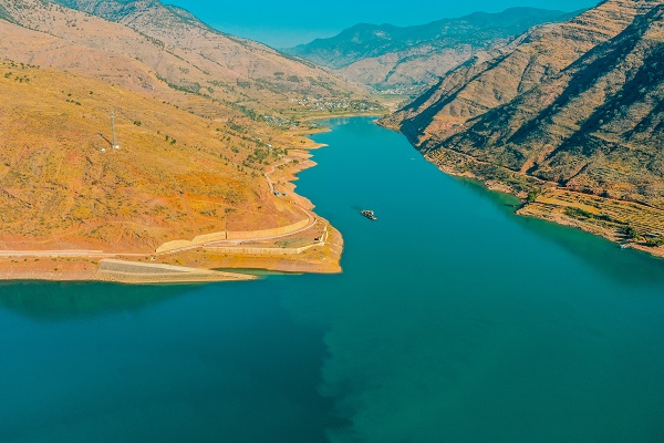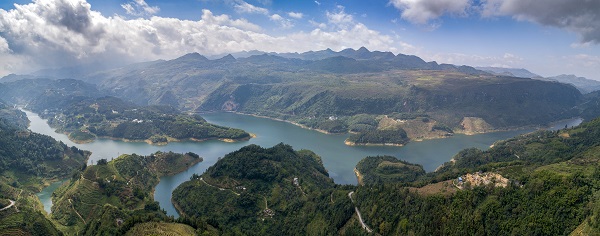 高峽出平湖,江似玉帶飄,行人穿山落,船從畫中來。遠眺仲夏的金沙江,天地雄闊。(李偉俊 攝)