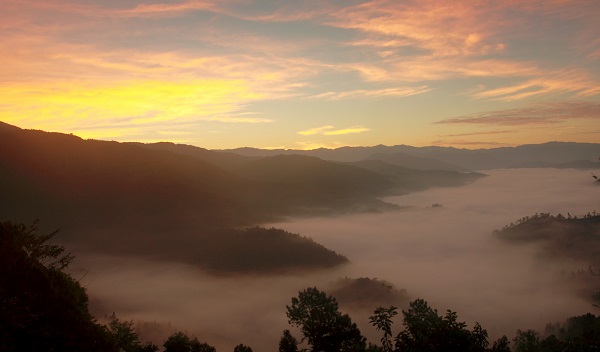 山間的黃昏,來得那樣迅速,那樣了無聲息,不知不覺,山石肅穆,云霧黯淡,樹影婆娑。(楊清舜 攝)