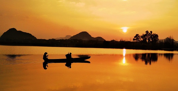 建水縣瀘江邊上,采荷而歸的農人正留戀著夏日最后一縷荷香之時,秋水長天已悄悄斂起夏色。( 梁艷 攝)