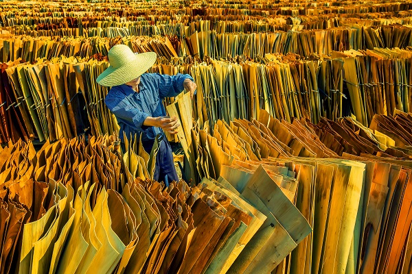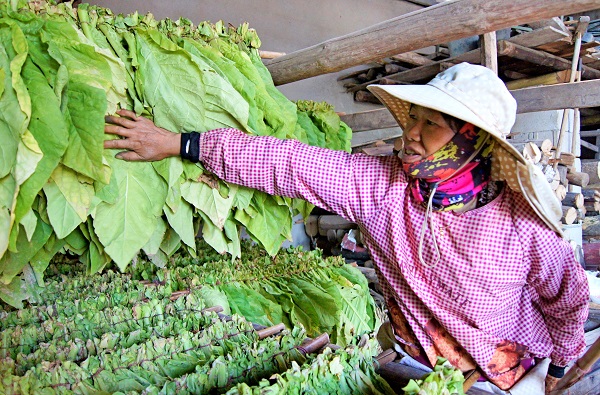立秋時節是烤煙烘烤的最佳時期,祥云縣的農人把綠油油的煙葉采回家中,綁煙、上煙桿、進烤房……(馮雪娥 攝)