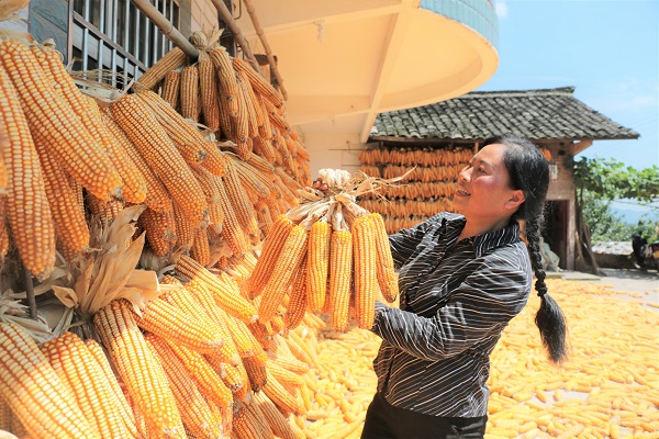 立秋至,曬秋忙。金燦燦的玉米鋪滿墻壁和院壩,讓付出辛勤勞動的農民喜笑顏開。(狄廷秀 攝)