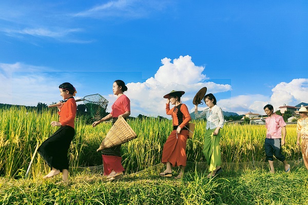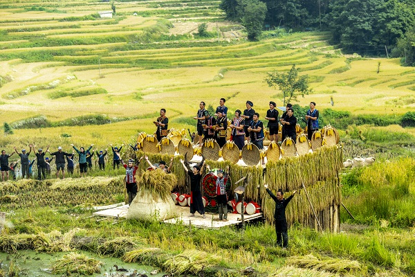 金秋九月,稻子飄香。個舊市的農(nóng)民們載歌載舞慶祝豐收,共享秋的碩果。(梁榮生 攝)