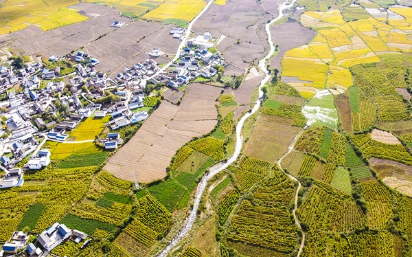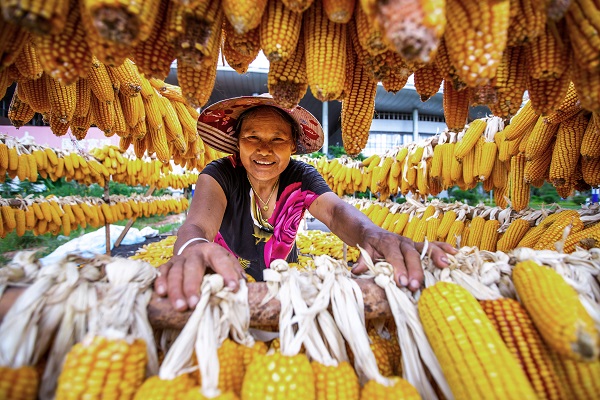 秋收時節(jié),普洱市思茅區(qū)農(nóng)民家的院子里掛滿金燦燦的玉米。(秦藝菲 攝)