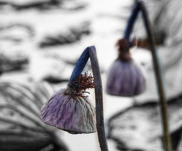秋意已暮,新冬將至。暮色中,池塘的荷葉早已凋殘,只留了幾片枯枝靜靜等待冬眠。(賈建榮 攝)