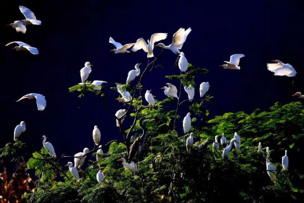 樹梢是白鷺的“游樂園”,一群白鷺在上面飛來躍去、追逐戲玩……這一切,都是那么新鮮有趣,幸福快樂。( 陳永剛 攝)
