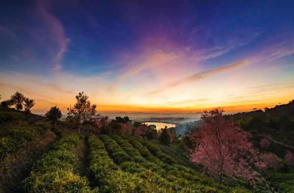 天光漸暗,在落日余暉渲染下,天邊的晚霞如同鋪開的綢緞,流光溢彩余霞散成綺,開啟了普洱茶園的燈火輝煌。(王雁 攝)