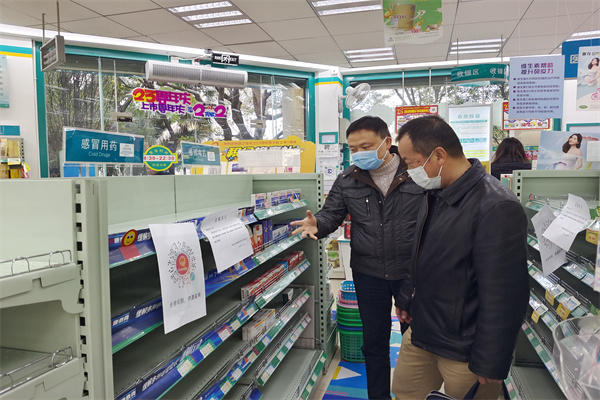疫情防控工作第一督查問效組深入藥品零售企業(yè),監(jiān)督檢查“一退兩抗”藥品停售下架情況。(吳敏 攝)