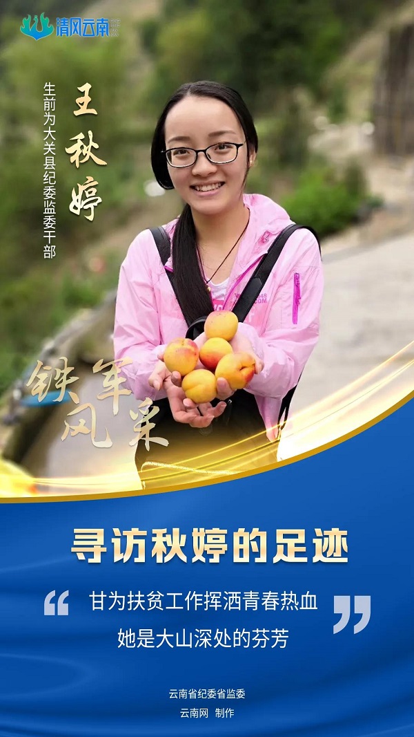王秋婷,生前為昭通市大關縣紀委監委干部,2017年10月,被選派到大關縣天星鎮打瓦村,成為駐村工作隊隊員。2018年11月19日,王秋婷在工作途中遭遇車禍因公殉職,年輕的生命永遠定格在了26歲,定格在了她傾注心血的一方熱土上。2018年12月,共青團云南省委、云南省青年聯合會追授王秋婷“云南青年五四獎章”榮譽稱號、云南省婦聯追授王秋婷“云南省三八紅旗手”稱號;2019年4月,云南省總工會授予王秋婷“云南省五一勞動獎章”;2019年6月,云南省委宣傳部追授予王秋婷2019年度“云嶺楷模”榮譽稱號;2021年,王秋婷被黨中央、國務院表彰為全國脫貧攻堅先進個人。