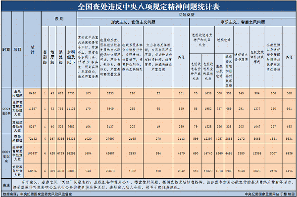 10月28日,中央紀(jì)委國家監(jiān)委公布了2021年9月全國查處違反中央八項規(guī)定精神問題匯總情況。今年9月,全國各級紀(jì)檢監(jiān)察機關(guān)共查處違反中央八項規(guī)定精神問題8420起,批評教育幫助和處理11937人,其中黨紀(jì)政務(wù)處分8247人。這是中央紀(jì)委國家監(jiān)委連續(xù)第97個月公布月報數(shù)據(jù)。