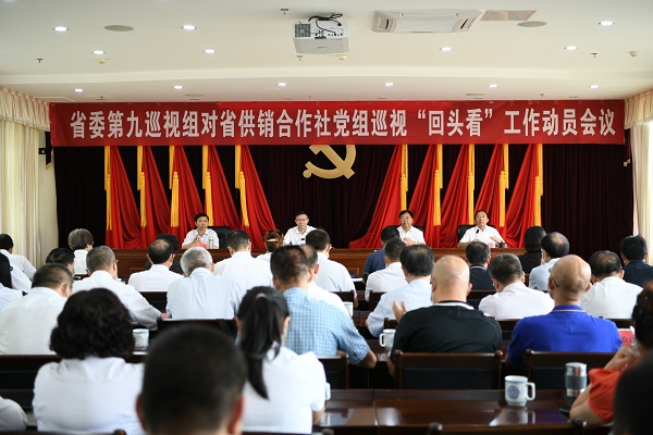 按照省委統一部署,8月13日,省委第九巡視組對省供銷合作社黨組巡視“回頭看”工作動員會召開。會前,省委第九巡視組組長沈光善主持召開與省供銷合作社黨組書記、理事會主任和麗貴的見面溝通會,傳達了省委書記阮成發聽取巡視工作有關情況匯報時的講話要求,通報了巡視“回頭看”工作安排。會上,沈光善作了動員講話,提出了要求;和麗貴主持會議并作表態講話。