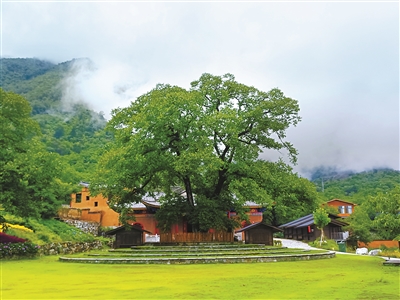 駐足,仰頭,迎面是一棵虬枝蒼勁、蔭蓋四圍的千年古核桃樹。樹身懸匾,上書:云上村莊。