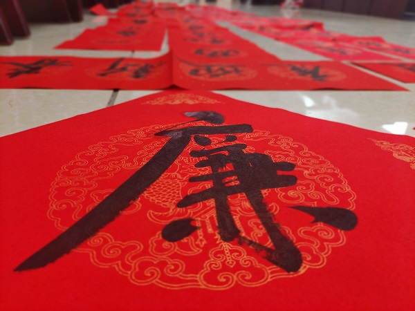散發著淡淡墨香和濃濃祝福的廉聯,傳遞著廉政清風和惠民新風。(王龍芹 攝)