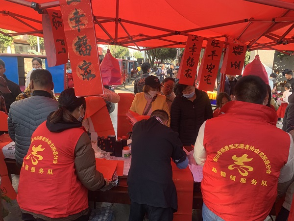勐糯鎮組織書法愛好者在趕集日為群眾書寫贈送春聯,傳遞黨和政府的關心與祝福。(蘇亞娟 攝)