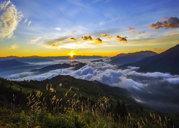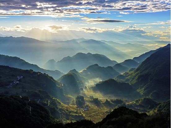 晨曦如約而至,千萬縷霞光穿透薄霧輕撫大地,綿延群山、靜謐村莊漸次蘇醒,美好的一天開始了。(王仲璋 攝)