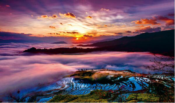 紅河縣桂東梯田云霧繚繞,流光溢彩,宛如仙境。(李信忠 攝)