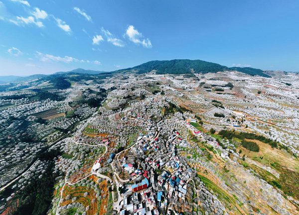 “冷艷全欺雪,余香乍入衣。”一樹樹梨花隨著山路的蜿蜒,躍動在春的明媚里。遠遠望去,一簇簇雪白的梨花如團團云絮、漫卷輕飄,漫山遍野的梨花連成了一片“雪的海洋”。(張航 攝)