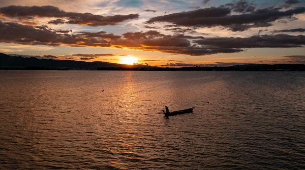 夕陽下,蒙自長橋海風平浪靜宛若一面巨大的鏡子,小舟劃過之處蕩起一朵朵漣漪。(李星 攝)