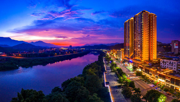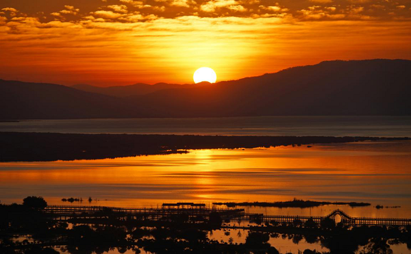 春季落日時,夕陽緩緩從北部乾陽山坳中隱去,夕陽照青山,異龍湖的湖水變得通體金黃,駕舟湖上,看夕陽西下,明月東升,詩意無限,別有一種閑云野鶴的逸情。(奠俊保 攝)