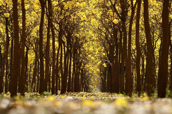 陽春三月,春風吹拂,黃風鈴花木綻放出金黃的花朵,光彩耀眼,好一幅“滿城盡帶黃金甲”的畫卷,美不勝收。(李海青 攝)