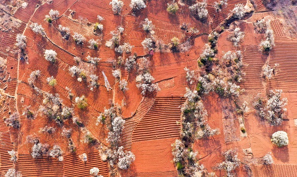 清明時(shí)節(jié),劍川縣桑嶺村古梨園梨花競(jìng)相綻放,高空俯瞰,如雪的梨花和鮮艷的紅土地交相輝映,農(nóng)民們耕作的身影在其中星星點(diǎn)點(diǎn),構(gòu)成了一幅絢麗的清明春景圖。(段滌暇 攝)