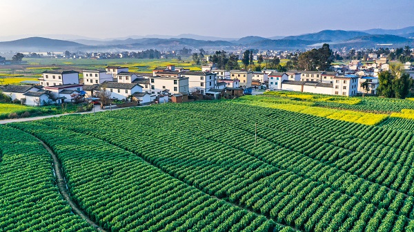 牟定縣共和鎮(zhèn)的田野里,長(zhǎng)勢(shì)喜人的蠶豆、油菜和新農(nóng)村交相呼應(yīng),構(gòu)成春日里生機(jī)盎然的田園生態(tài)風(fēng)景畫。(李光洪 攝)