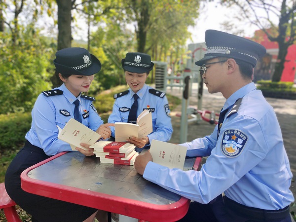 公安干警利用業余時間交流叢書學習心得。(王龍芹 攝)