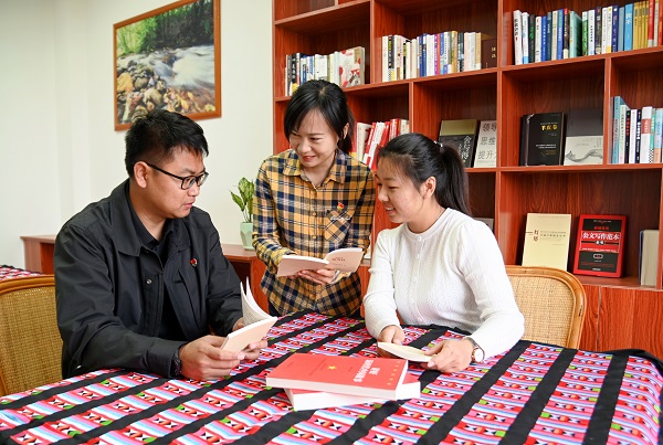 西盟縣紀委監委以“周一學習例會”為契機,組織紀檢監察干部對口袋書中的豐富內容進行學習研討,極大地提高黨員干部的學習興趣和學習效率。(楊夢笛 攝)