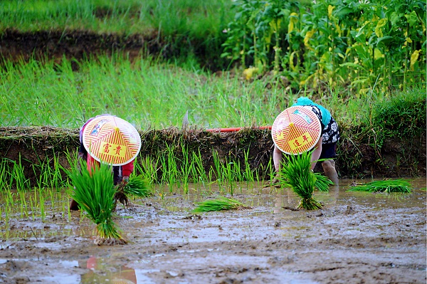 清溝引水、蓄水浸田、栽秧插秧,農民們在稻田里躬身插秧,播種希望。(龔曉 攝)