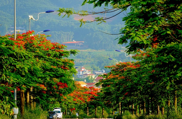 鳳凰花開得熱烈,一簇簇火紅點綴在郁郁蔥蔥的綠葉間,演繹著激情夏日的生機與活力。(李佳佳 攝)
