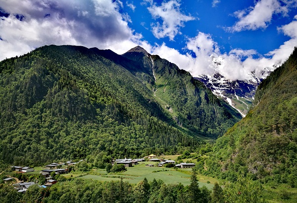 芒種時節的迪慶高原,白色雪山與綠色草甸交相輝映,安靜的村莊祥和寧靜,人與自然和諧交融。(莊群能 攝)