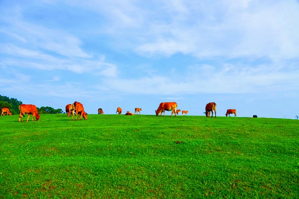藍天下,微風中,牛群悠閑自在地享受著暖陽和鮮嫩青草。(王銘堅 攝)
