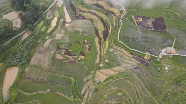 位于世界文化遺產哈尼梯田核心區域的紅河哈尼族彝族自治州元陽縣阿者科村,勞動者們以梯田為畫板,以不同顏色的水稻為墨,繪制了一幅“喜迎二十大”的梯田稻畫,表達了邊疆人民心向黨的真摯情感。(元陽縣紀委監委 普健梅 攝)