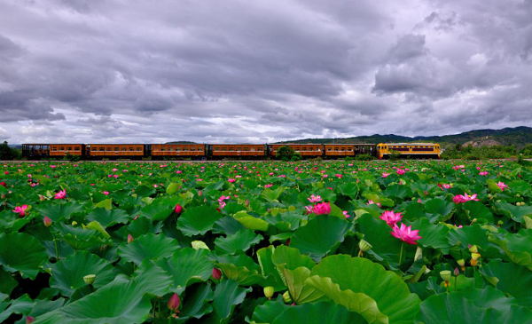 團團荷葉,灼灼紅蓮。在建水縣團山民居村落邊,一列觀光小火車行駛在百年米軌之上,從荷葉鋪就的碧綠中,緩緩駛向遠方。(建水縣紀委監委 宗慶 攝)