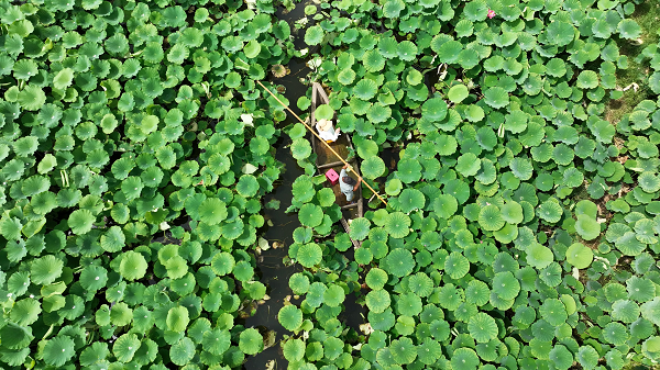 盛夏,荷塘碧綠蒼翠,水面上荷葉挨挨擠擠、層層疊疊鋪展開來,接天蓮葉,甚似壯闊,引得游人乘舟而來,近距離欣賞這荷葉田田的美景。(個舊市紀委監委 馬子豪 攝)
