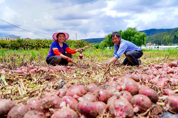 秋風吹“紅”了洋蔥,云南安寧迎來大豐收,采收、分揀、裝袋……村民忙得不亦樂乎。(聶涵 攝)